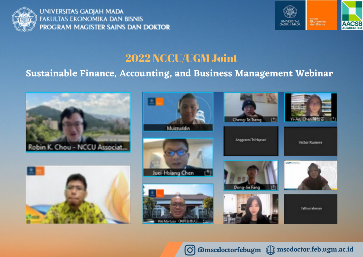 The Master of Science and Doctoral Program (MD) FEB UGM in collaboration with NCCU (National Chengchi University), successfully held a webinar on the topic “Sustainable Finance, Accounting, and Business Management” on January 12nd, 2022. This activity aims to facilitate students for increasing theoretical insight and scientific contributions in research. Thus, the benefits of cooperation between the two universities can be conveyed properly.