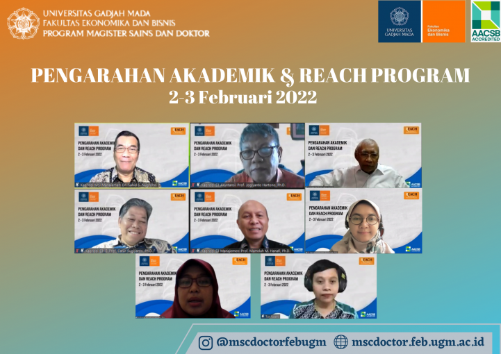 The Master of Science and Doctoral Program of FEB UGM held the Academic Briefing and Researchers’ Enrichment Program (REACH Program) for new students in the 2021/2022 Even Semester. This activity lasts for two days, Wednesday-Thursday, February 2nd -3rd, 2022. This activity for new students is carried out online through a Zoom meeting. A total of 79 new students from the Master of Science and Doctoral Program attended the full activity.