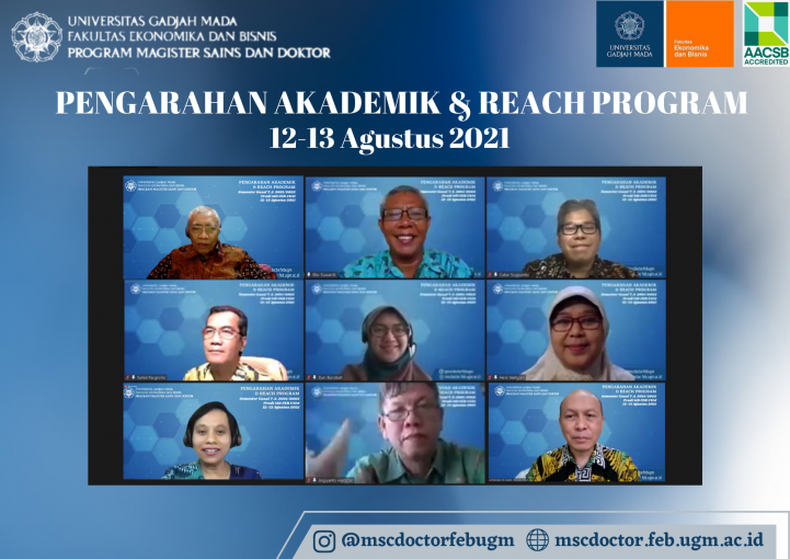The Master of Science and Doctoral Program of FEB UGM held the Academic Briefing and Researchers’ Enrichment Program (REACH Program) for new students in the 2021/2022 Odd Semester. This activity lasts for two days, Thursday-Friday, August 12-13, 2021. This activity for new students is carried out online through a Zoom meeting. A total of 107 new students from the Master of Science and Doctoral Program attended the full activity.