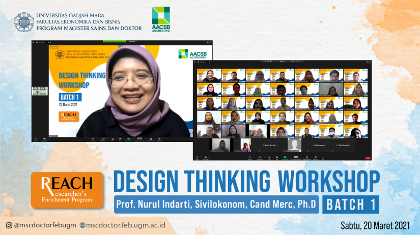 On Saturday (03/20/2021), the Master of Science program FEB UGM held an online Design Thinking Workshop Batch 1 through Zoom meeting. This event is one part of the REACH (Researcher’s Enrichment) Program. Design Thinking Workshop is a mandatory program which aims to create and improve students’ thinking skills critically, creatively, and innovatively. The development of this mindset will support the ability to analyze comprehensively, deeply, and systematically, so it is in line with the Master of Science program at FEB UGM, namely forming graduates who are capable of conducting independent research and knowledgeable with deep theoretical concepts.