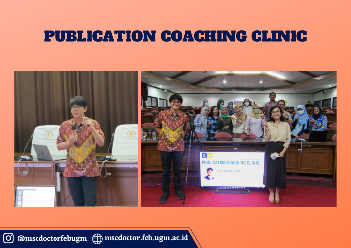The Master of Science and Doctoral Program (MD) FEB UGM has successfully held a Publication Coaching Clinic event on December 14th, 2022. This Publication Coaching Clinic is open to all FEB UGM students and held from 14.00-16.00 WIB. This event was held offline, took place at the BRI Auditorium Room Lt. 3 FEB UGM Building, and presented Mr. Felix Septianto, Ph.D., Australian Research Council DECRA Fellow at The University of Queensland, Senior Lecturer at The University of Queensland, as a speaker and Mrs. Widya Paramita, M.Sc., Ph.D., as a moderator.