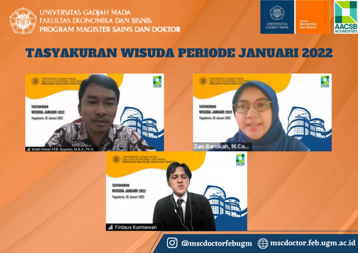 In this period, FEB UGM has graduated as many as 26 students with details of 14 students from the Master of Science in Accounting Program, 6 students from the Master of Science in Economics Program, and 6 students from the Master of Science in Management Program. Wisdom and happiness were poured out at the tasyakuran graduation period in January 2022, which was held online through Zoom meeting. This event began with the submission of a report on graduate statistical data by Mrs. Zuni Barokah, M.Comm., Ph.D., Head of the Master of Science in Accounting Program of FEB UGM, as the management representative.