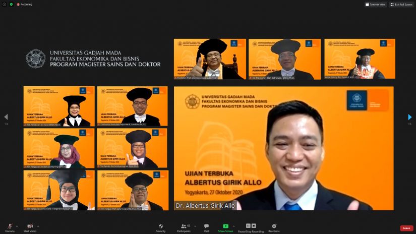 Yogyakarta – Tuesday, October 27, 2020. The Master of Science and Doctoral Program, Faculty of Economics and Business, Gadjah Mada University (MD FEB UGM), held an open doctoral promotion exam for promovendus Albertus Girik Allo, S.P., M.Si. The session chaired by the Dean of FEB UGM, Eko Suwardi, M.Sc, Ph.D. Also attending were the Promotor and Co-promotor: Prof. Lincolin Arsyad, M.Sc., Ph.D., and Elan Satriawan, M.Ec., Ph.D., also present the assessment team and examination team, namely Amirullah Setya Hardi, Cand. Oecon., Ph.D., Eny Sulistyaningrum, MA, Ph.D., Dr. Evi Noor Afifah, M.S.E., Prof. Catur Sugiyanto, M.A., Ph.D., Dr. Evita Hanie Pangaribowo, M.Int.Dev.Ec., and Dr. Endah Saptutyningsih, M.Si. Also present were the promovendus family, work relatives from the University of Papua, and all guests.