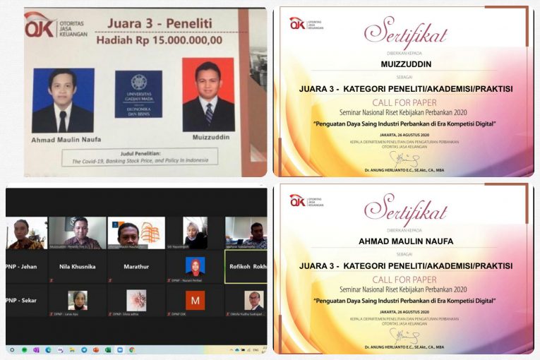 Yogyakarta-26 Agustus 2020. Ahmad Maulin Naufa dan Muizzudin, Mahasiswa Program Doktor Ilmu Manajemen, Fakultas Ekonomika dan Bisnis, Universitas Gadjah Mada, berhasil meraih Juara III Kategori Akademisi pada Call for Paper yang diadakan oleh Otoritas Jasa Keuangan (OJK). Kegiatan yang bertajuk “Seminar Nasional Riset Kebijakan Perbankan 2020” tersebut diikuti oleh finalis dari berbagai latar belakang seperti mahasiswa, praktisi perbankan, hingga peneliti dan akademisi.