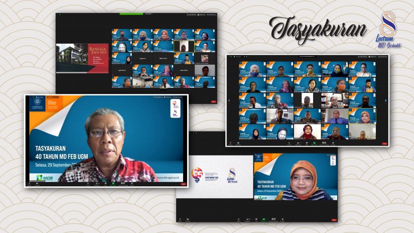 Yogyakarta-Selasa, 29 September 2020. Rangkaian kegiatan Dies Natalis ke 40 tahun Program Magister Sains dan Doktor, Fakultas Ekonomika dan Bisnis, Universitas Gadjah Mada (MD FEB UGM) mencapai puncak perayaannya. Tasyakuran 40 Tahun MD FEB UGM berlangsung selama 1 (satu) jam dalam forum virtual dan berlangsung dalam semarak serta bernuansa kekeluargaan. Acara dibuka dengan menyanyikan lagu Indonesia Raya dan Hymne Gadjah Mada dan dilanjutkan sambutan pembuka oleh Koordinator Pengelola Program MD FEB UGM, Nurul Indarti, Sivilokonom, Cand.Merc., Ph.D. Dalam sambutannya, beliau menyampaikan peringatan Lustrum 8 sangat istimewa meski dilangsungkan di tengah pandemi namun rangkaian acara berlangsung lancar seperti: (1) “MD Competition” yang dilaksanakan oleh FORKOMSI; (2) “MD Webinar Pengelolaan Mutu Pendidikan: Tilikan 40 Tahun Meneguhkan Nilai”; (3) “MD Berbagi” Webinar yang bertajuk “Bias di Penelitian dan Cara Mitigasinya”; (4) “MD Open House” yang dilaksanakan oleh IMADEBGAMA; (5) MD Anjangsana yang berlangsung 23 September 2020; hingga (6) “MD Tasyakuran” yang berlangsung hari ini. Disampaikan pula kondisi statistik terkini Program MD, pencapaian MD termasuk reakreditasi AACSB, berbagai agenda penulisan buku tahunan, beserta Sejarah dan Riwayat MD.