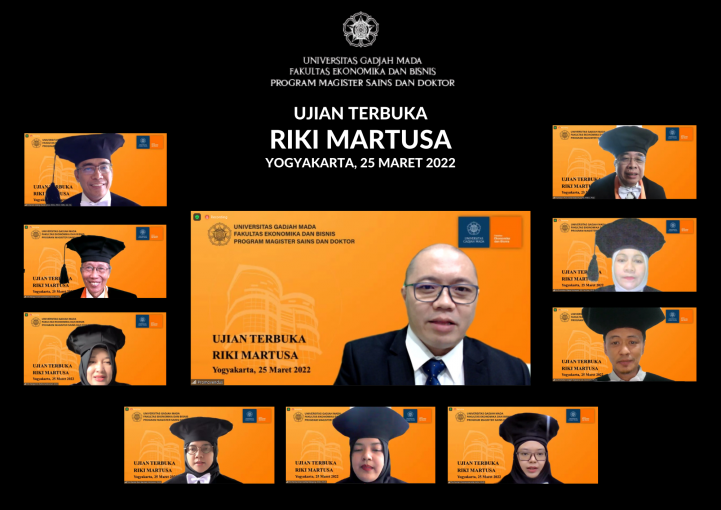 Program Magister Sains dan Doktor (MD) FEB UGM telah mengadakan ujian terbuka promosi doktor Ilmu Akuntansi bagi promovendus Riki Martusa. Bapak Rusdi Akbar, M.Sc., Ph.D., CMA., Ak., CA., Ketua Departemen Akuntansi, bertindak sebagai Ketua Sidang. Dalam Ujian Terbuka kali ini, hadir Prof. Indra Wijaya Kusuma, M.B.A., Ph.D., selaku promotor serta Dr. Ratna Nurhayati, S.E., M.Com., Ph.D. dan Singgih Wijayana, S.E., M.Comm., Ph.D. selaku ko-promotor. Selain itu, hadir pula tim penilai yang meliputi Zuni Barokah, M.Comm., Ph.D., Dian Kartika Rahajeng, M.Sc., Ph.D., dan Choirunnisa Arifa, M.Sc., Ph.D. Adapun tim penguji dalam sidang kali ini adalah Prof. Suwardjono, M.Sc., Ph.D. dan Dr. Ratna Candra Sari, M.Sc. Turut hadir pula keluarga calon doktor, kerabat kerja dari Universitas Kristen Maranatha, dan para tamu undangan.