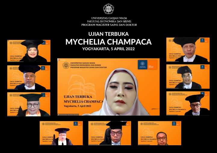 Program Magister Sains dan Doktor (MD) FEB UGM telah mengadakan ujian terbuka promosi doktor Ilmu Manajemen bagi promovendus Mychelia Champaca. Prof. Nurul Indarti, Sivilokonom, Cand.Merc., Ph.D., Ketua Departemen Manajemen, bertindak sebagai Ketua Sidang. Dalam Ujian Terbuka kali ini, hadir Prof. Mamduh M. Hanafi, M.B.A., Ph.D. selaku promotor serta I Wayan Nuka Lantara, M.Si., Ph.D. dan Bowo Setiyono, M.Com., Ph.D. selaku ko-promotor. Selain itu, hadir pula tim penilai yang meliputi Prof. Eduardus Tandelilin, M.B.A., Ph.D., Eddy Junarsin, M.B.A., Ph.D., dan Prof. Irwan Trinugroho, M.Sc., Ph.D. Adapun tim penguji dalam sidang kali ini adalah Agus Setiawan, M.Soc., Ph.D. dan Prof. Marwan Asri, M.B.A., Ph.D. Turut hadir pula keluarga calon doktor, kerabat kerja dari Universitas Brawijaya, dan para tamu undangan.