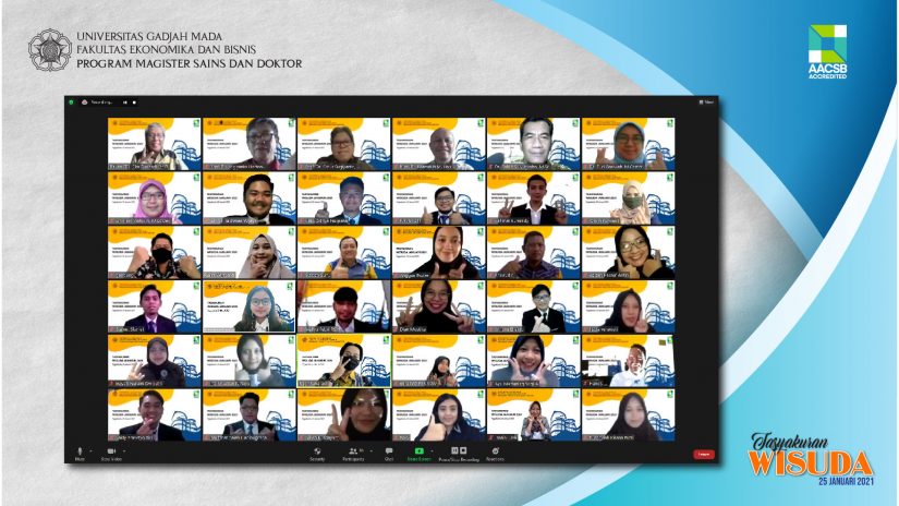 Pada hari Rabu 20 Januari 2021 yang lalu, 25 Mahasiswa Magister Sains dan 1 Mahasiswa Doktor FEB UGM telah mengikuti prosesi wisuda yang dilaksanakan secara daring. Meskipun masih dalam nuansa pandemi, tak mengurangi semangat dan antusiasme para wisudawan untuk mengikuti setiap prosesi melalui platform Zoom.
